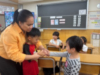 英語であいさつをしたり、歌ったり、踊ったりします!