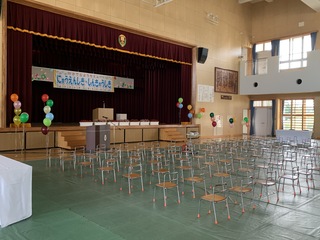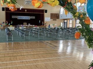 小学校の体育館に会場を変更し、会場設営・装飾を行いました。
