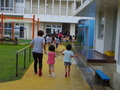 小学生のお兄さん、お姉さんと一緒に訓練することで、避難の仕方を学ぶ